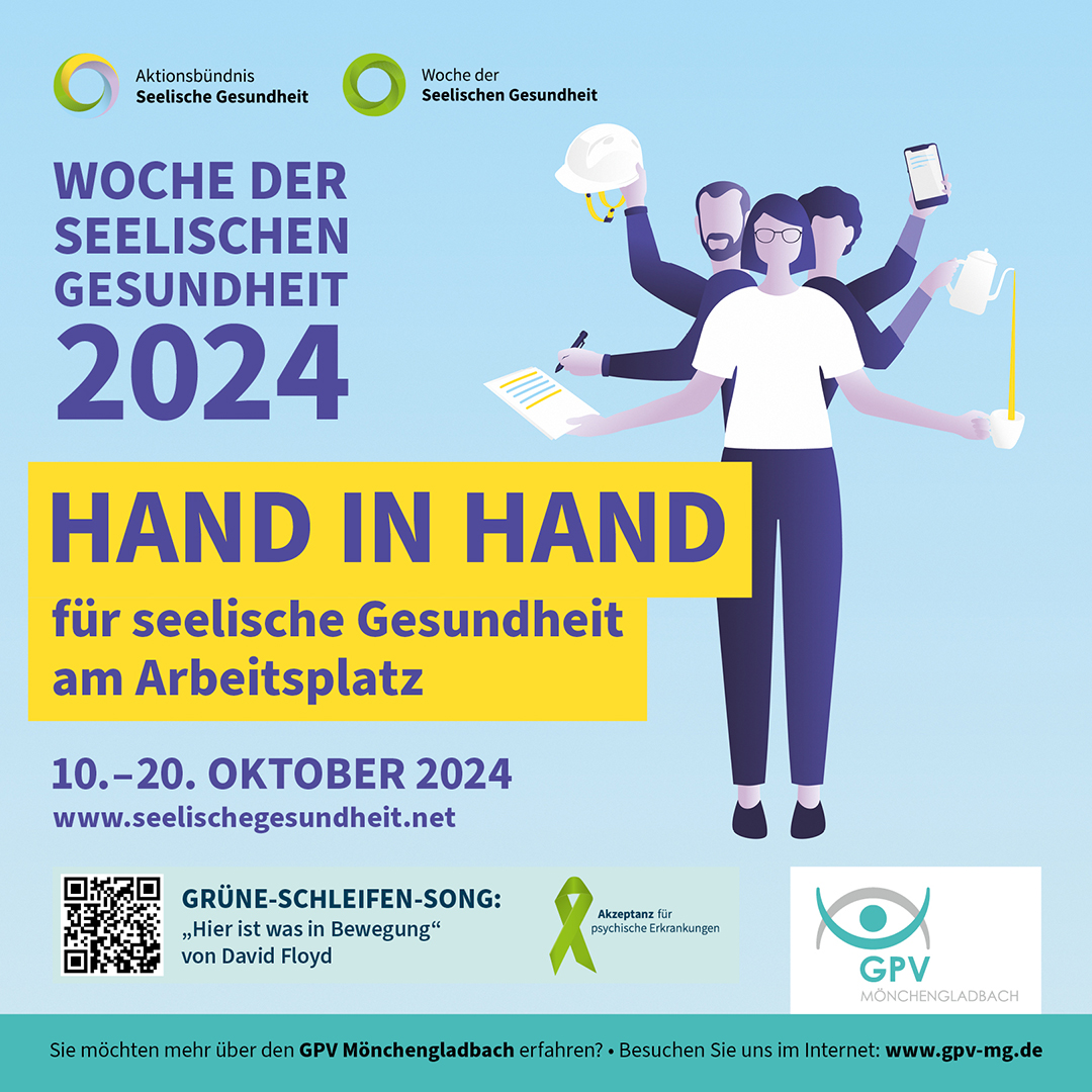 Anlässlich der Woche der seelischen Gesundheit lädt der Gemeindepsychiatrische Verbund Mönchengladbach (GPV-MG) am Samstag, 07. Oktober 2023 unter der Schirmherrschaft der Mönchengladbacher Dezernentin für Gesundheit und Soziales, Frau Dörte Schall, zu einem Aktionstag auf den Sonnenhausplatz ein.